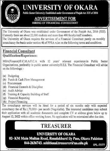 The University of Okara, established in 2016 through the Government of the Punjab Act (XIII), currently has a student population of 22,000 and over 400 faculty and staff members. The institution has recently advertised for a Financial Consultant to be employed on a contractual, monthly basis, as specified by section 46 of the PPRA Rules. Male and female candidates alike may apply for the opportunity, and successful applicants will be employed in one of the newest government jobs in Pakistan.